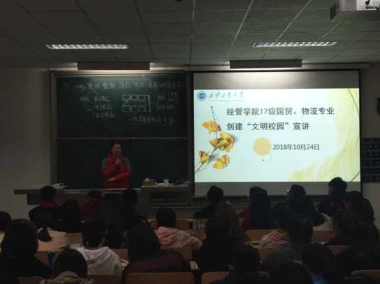 2018年10月24日下午,437437必赢国际网址曲峡老师为17级国贸、物流专业学生在教2-305举办了创建“文明校园”的宣讲会。 讲座一开始,老师给我们讲述了她最近查宿舍所得到的反馈,她用实际的例子让我们懂得宿舍是大...