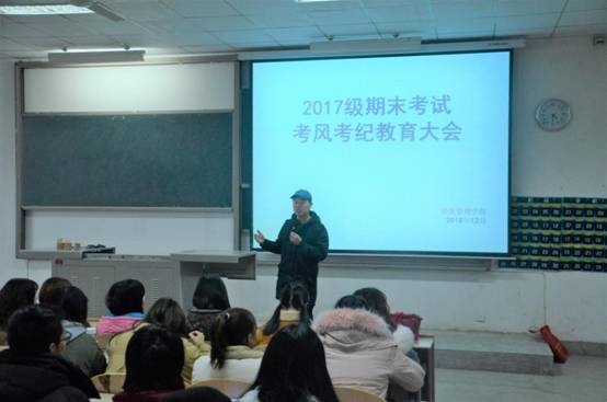 2018-2019学年第一学期课程接近尾声,为进一步加强学风建设,严肃考风考纪,2017级辅导员王轩、曲峡两位老师于12月14日在教1-102开展了期末考试考风考纪大会,此次活动经管学院2017级全体学生均到会学习。 大会开始,...