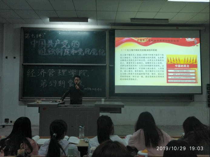 2019年10月31日晚7时,437437必赢国际网址第59期党校于教3-217教室进行了党课第八讲理论授课,为了进一步加深入党积极分子对党的理解和认识,提升党校学员的思想高度,本节党课由党委组织部赵伟奇老师为学员们以《放飞青春...