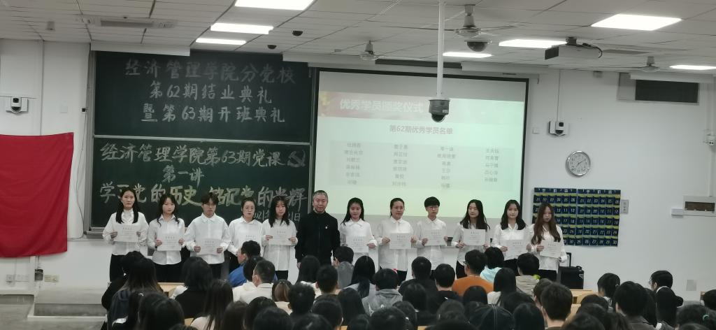 工商第三学生党支部书记侯剑波宣布优秀学员名单,并由王守民老师和姬浩老师为第62期党课优秀学员颁奖并合影留念。第62期优秀学员代表吕心涛同学上台发表,她希望在场学员勇担时代赋予青年人的使命与责任,从思想和行动上都积极向党组织靠拢,争取早日加入中国共产党。