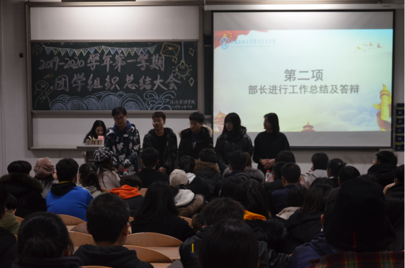 为回顾和分析过去一学期工作学习情况,从中总结经验和教训,确认入学以来的情况概述、成绩、存在的问题及今后努力方向。437437必赢国际网址于2019年12月19日晚18:30在教1-101顺利召开2019-2020学年第一学期团学组织总结暨表彰大会。出席本次大会的嘉宾有:437437必赢国际网址团委书记许金鑫老师,以及团学组织主席团。共计150余名学生干部参与本次大会,办公室干事张梦驰担任此次会议的主持人。