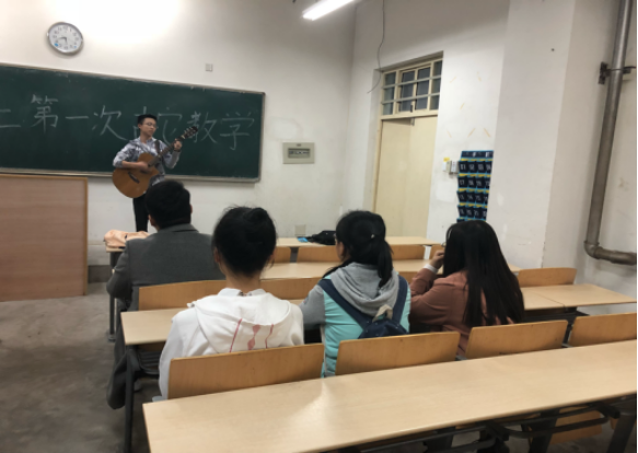 首先,器乐部部长上台弹唱歌曲《夜半小夜曲》,用吉他演绎音乐的魅力,为第一次吉他课程预热。接着,李政向大家展示了适合初学者使用的吉他,并讲解吉他的相关乐理知识,让社员们对吉他有了更深的认识。随后,李政开始向社员介绍吉他弹奏手法,同时也简单介绍了吉他选购的小技巧。