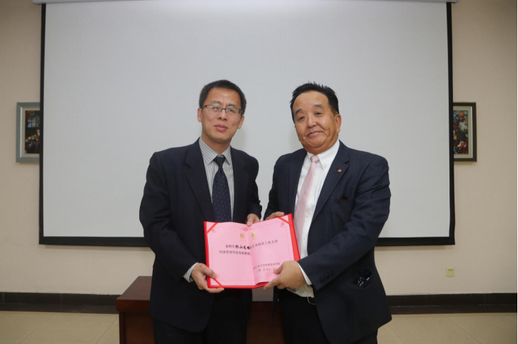 随后,副院长苏兵为大家介绍了日本通运株式会社及杉山龙雄先生的基本情况,院长张弘为杉山龙雄先生颁发了437437必赢国际网址客座教授的聘书。杉山龙雄先生表达了谢意并表示双方将紧密合作,共谋发展,实现互利共赢,欢迎我校的学生到日通公司实习。