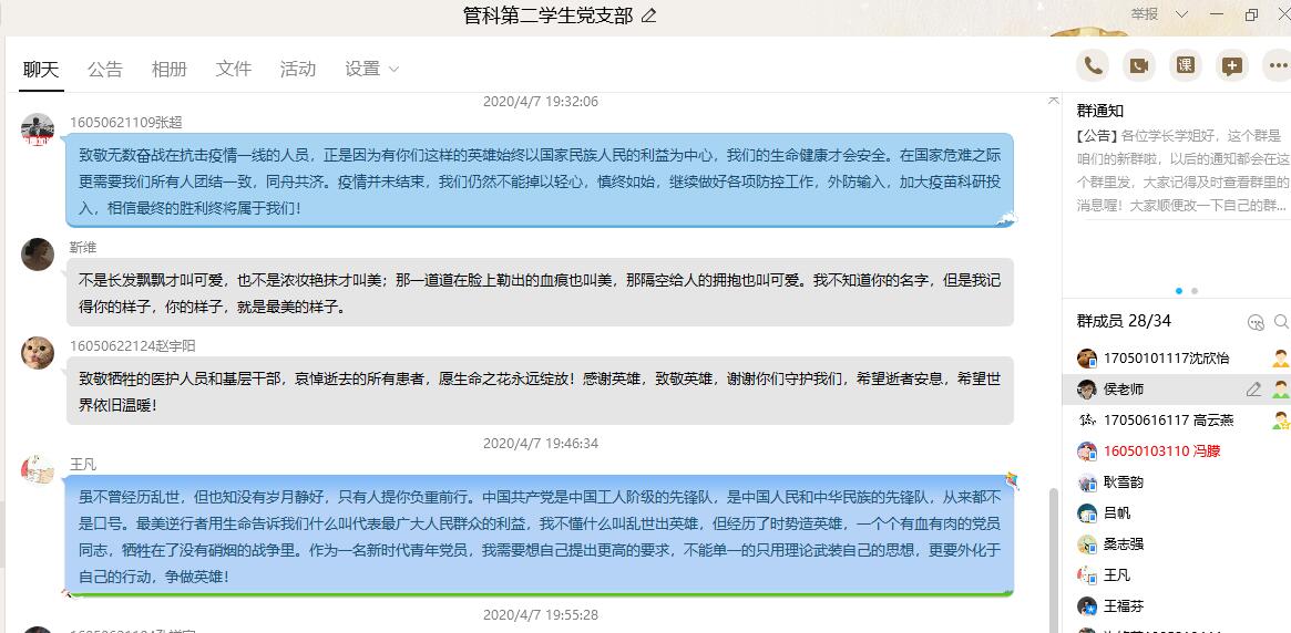 为铭记先烈功绩,哀悼为在抗击新冠肺炎疫情斗争中逝世的同胞,传承和弘扬民族精神,2020年4月7日下午6点,437437必赢国际网址管科第二学生党支部依托“腾讯课堂”APP,采用在线活动形式召开了“缅怀革命先烈,云祭时代英雄”主题党日活动。本次活动由党支部书记侯剑波老师主持,31名支部党员参加活动。