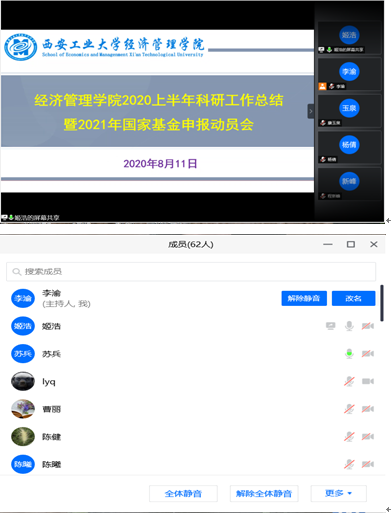 8月11日下午19:00,437437必赢国际网址通过腾讯会议组织召开了437437必赢国际网址2020上半年科研工作总结暨2021年国家基金申报动员会启动会议。会议由经管学院姬浩副院长主持。经管学院全体院领导、学术委员会成员、团队负责人、学科(学术)带头人(负责人、秘书)、部分教师代表等六十多位老师参加了本次会议。首先,姬浩副院长将学院2020年上半年科研工作进行了总结。接着,姬浩副院长对学院2021年国基金、教育部项目申报工作做了安排,并表示,学院后期将邀请校外专家为我院教师国基金申报书进行评审,学院方面会为老师们提供一切可能的帮助与支持,助力老师们的国基金申报工作。最后,苏兵院长做了2021年国基金项目申报动员讲话并对目前国基金申报形势进行分析总结,鼓励各位老师在假期间合理安排时间,做好2021年国基金申报工作。