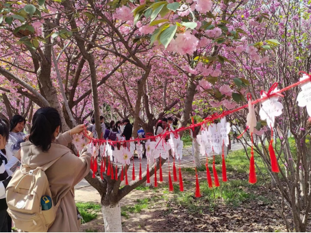 “琼心畅怀揽春景,笔墨丹青表诗意”。走进“识樱·对影”展位,落英缤纷的樱花树下,一群群朝气蓬勃的学生正结伴而行,赏花游乐,印章纪念。悠悠转入“荆桃·心诚,影底·阳春”展位,一条条祈福红绳都是对春日风光无限好的美好祝福、一张张春日限定美图都倾泻着作者心中最美的校园春景。